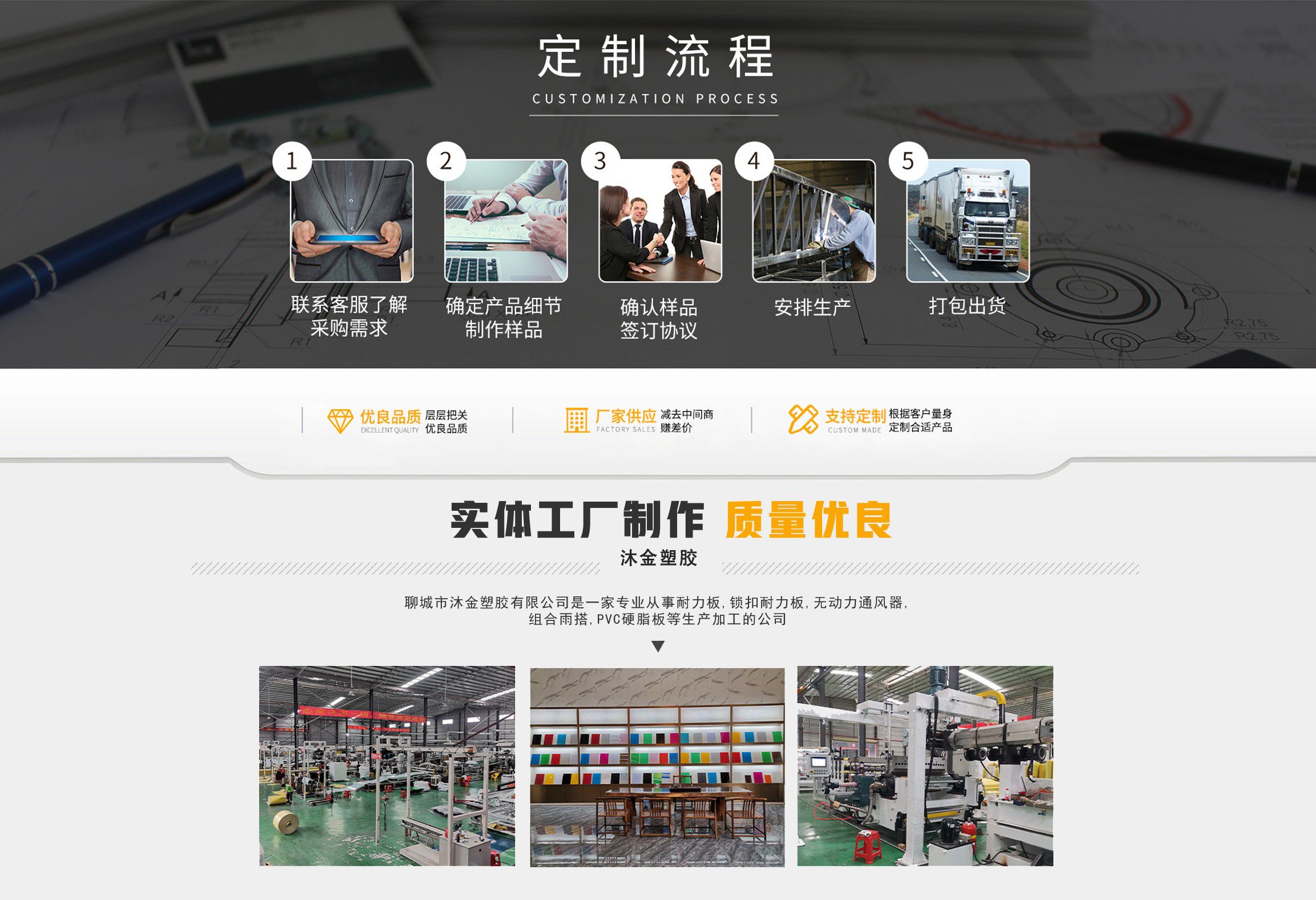 聊城市沐金塑膠有限公司注冊資金2180萬元,占地20000余平方,擁有自建廠房15000平方,員工100余名。10余年來,公司主營耐力板,鎖扣耐力板,耐力板深加工,無動力通風器,組合雨搭,PVC硬脂板,耐力板廠家等板材的發展戰略,逐漸成長為綜合性企業?! 」緭碛卸鄺l板材共擠生產線,采用世界知名品牌進口原材料和先進工藝,依據完善的ISO9001質量管理體系和ISO14001環境管理體系,為產品的卓越品質提供了強有力的保證。憑借過硬的創新能力和堅實的硬件基礎,贏創已成為國內領先的熱塑性板材生產商,產品被廣泛應用于建筑業、農業、工業、廣告業、安防行業及DIY領域?! 」臼冀K致力于通過提供最優的板材應用解決方案,為客戶創造最高的價值;堅守創新、質量、靈活、服務和速度的核心價值觀;堅持“完美的產品需要完美服務的支持”的經營理念,努力實現成為世界領先的板材與解決方案供應商的夢想?! ≡谖磥?,公司將立足客戶需求,不斷改變和完善現有產品,拓展產品線和充分開發板材的應用領域,為客戶創造全方位的價值。同時更好地實現員工的價值,實現公司團隊的價值。我們將與您一起創贏未來! 企業使命:成為世界領先的板材與解決方案供應商。 公司愿景:通過提供最優的板材應用解決方案,為客戶創造最高的價值?! 『诵膬r值觀:質量...